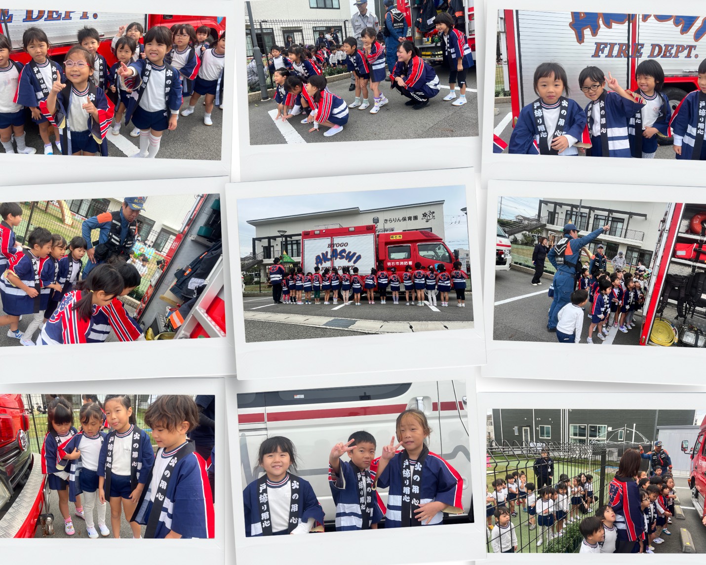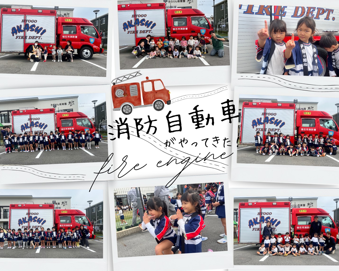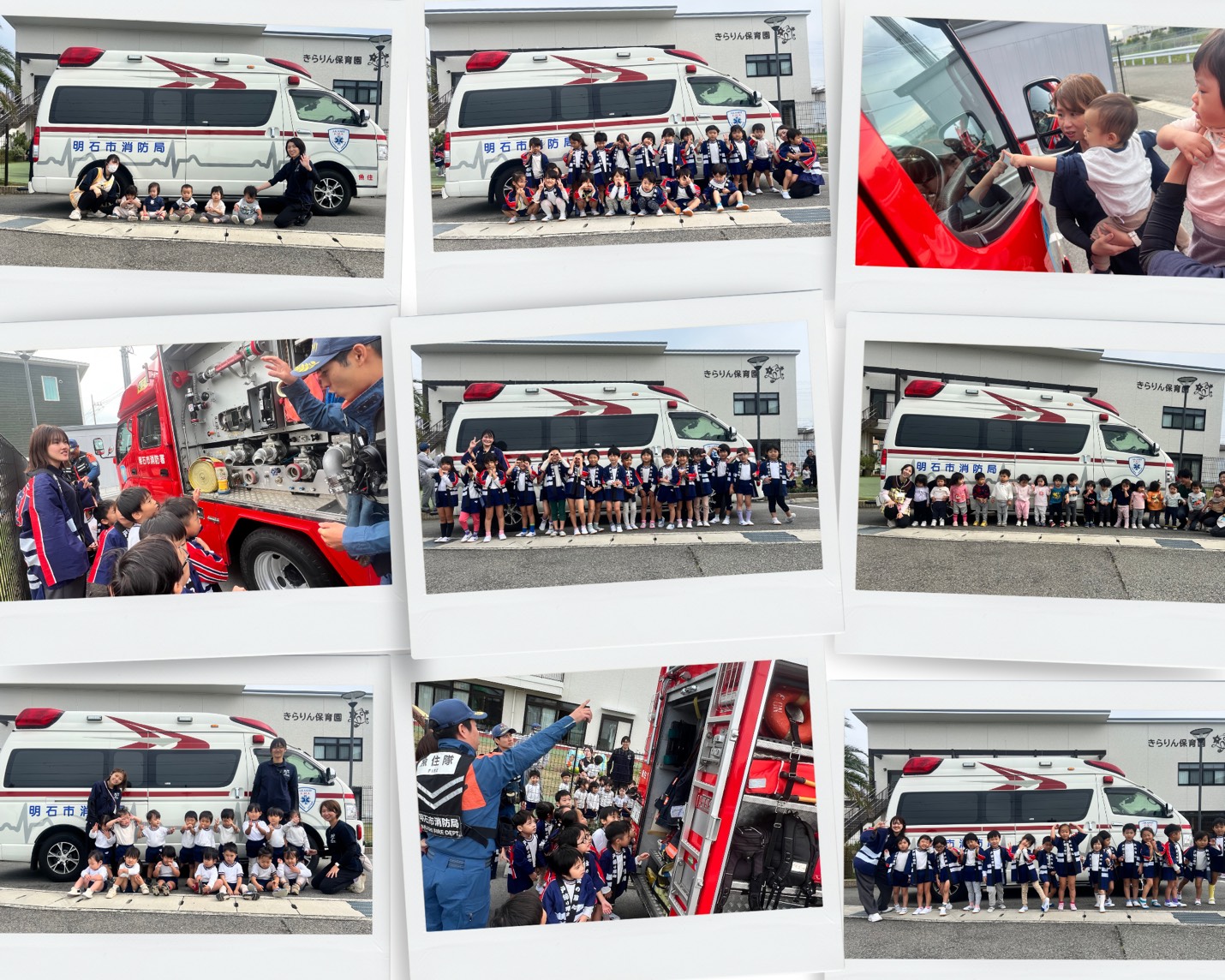 「子ども防火教室」を開催しました。子どもたちは楽しみにしていた「消防自動車」と「救急車」に大喜び!…先生たちもお勉強!…消化訓練や通報訓練では、実際に通報してみていざという時に必要なことをたくさん学びました。消防車にはいろんな道具が積んであり子どもたちは興味津々、「これは何?」「あれは何?」の質問にも消防士さんは優しく丁寧に一つひとつ話をしてくれました。魚住分署の方には、お忙しい中、快く依頼をお受けいただき本当に感謝しております。ありがとうございました!