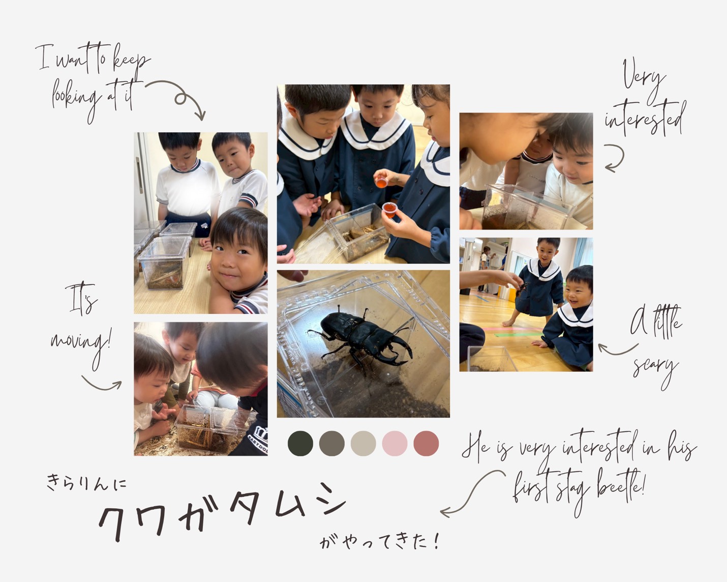 N先生がクワガタムシを持ってきてくれました!子どもたちは興味津々✨…さあ!…「クワガタムシ」飼育チャレンジのstartです。各クラスでクワガタムシを飼育します。みどり組のお友だちは色々調べて飼育の方法を教えてくれました。大切に育てたいと思います。