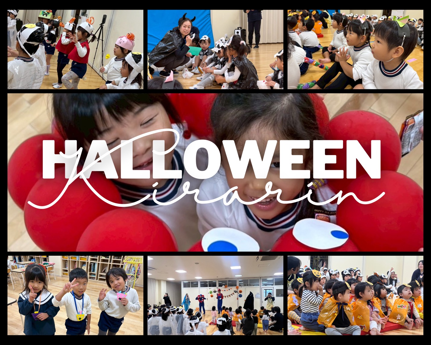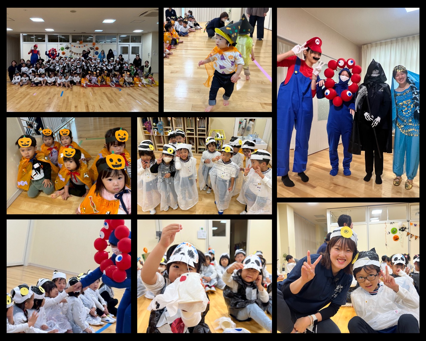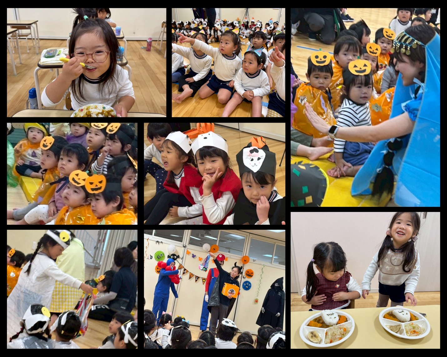「ハロウィンパーティ」をしました。各クラスで作った衣装はとっても可愛い❤️…まずは「ハロウィンってどんな日かな?」というお話を聞きました。真剣に聞き入る子どもたち。先生たちの仮装では大好きな「プリンセス」や「ミャクミャク」も登場!…「トリックオアトリート」の掛け声も完璧でした!楽しかったね(*’▽’*)!