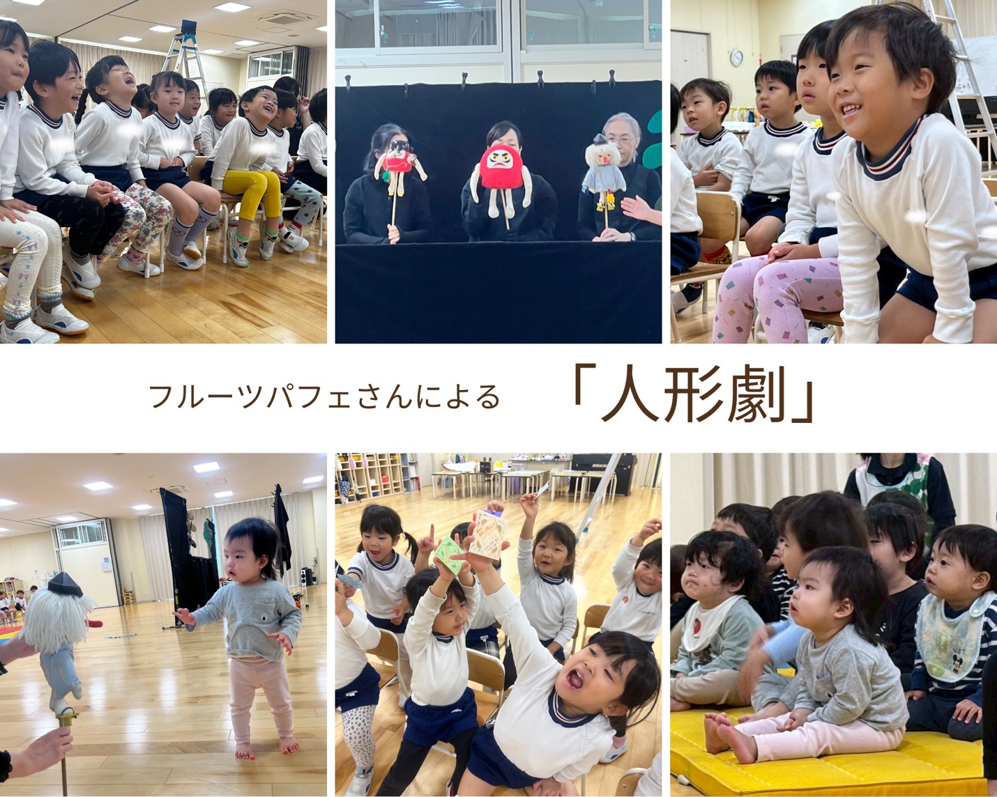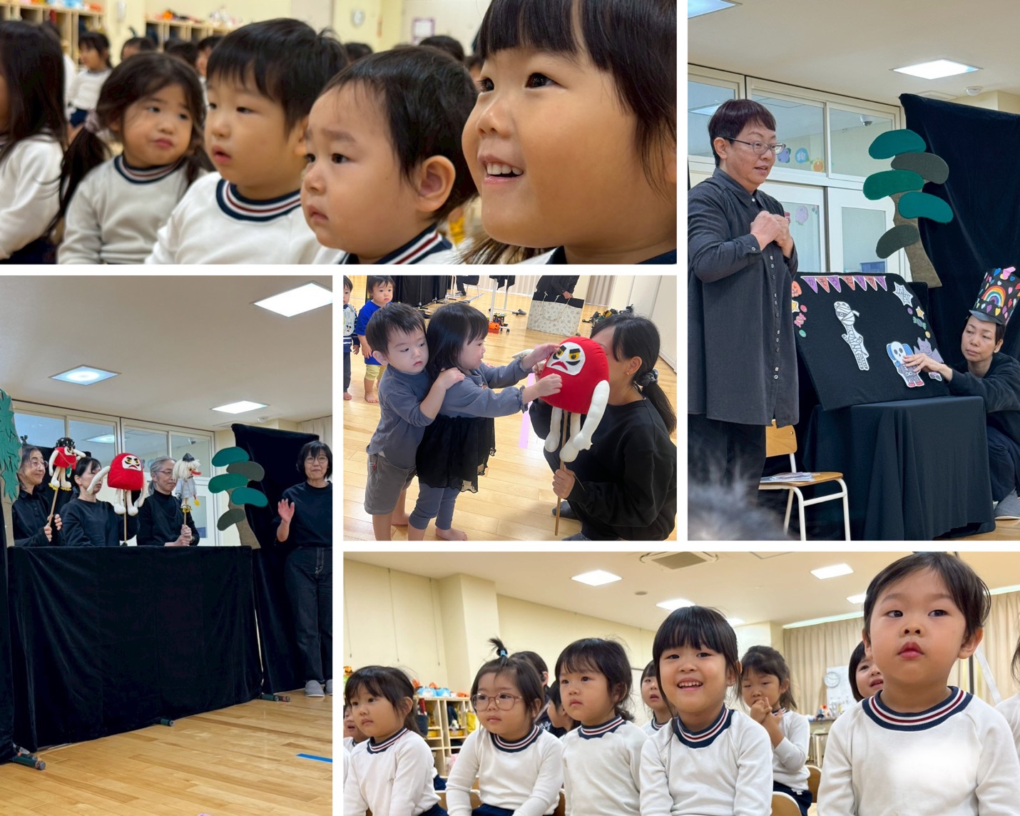 フルーツパフェさんが来園…「だるまちゃんとてんぐちゃん」の人形劇を観覧しました。他にも手遊びやハロウィンのパネルシアターなど内容も盛りだくさん!最後は、にじぐみさんから花束のプレゼントでお礼をしました。…真剣にお話を聞いたり、大声で笑ったり、楽しい時間を過ごしました!