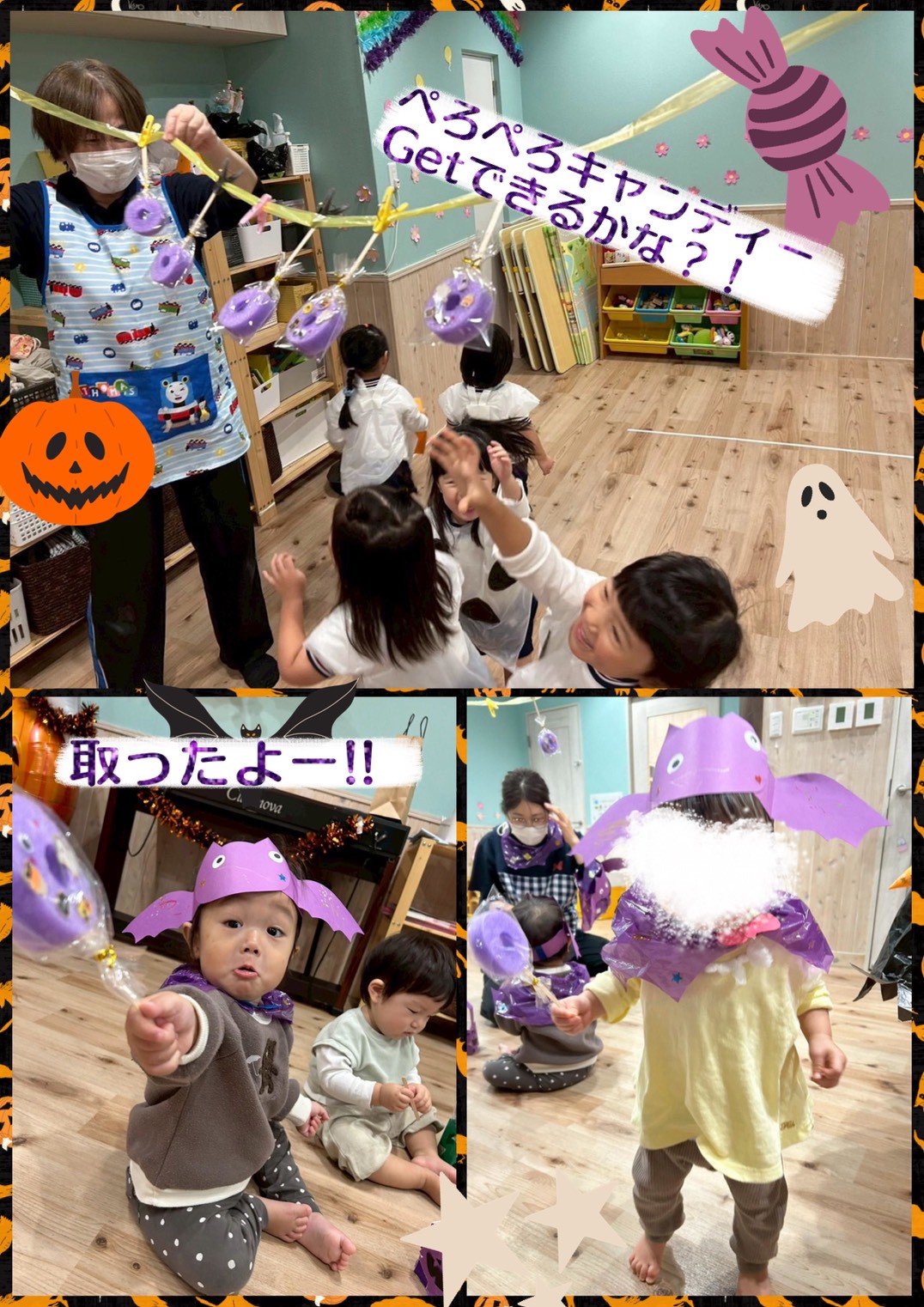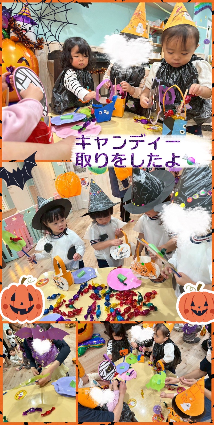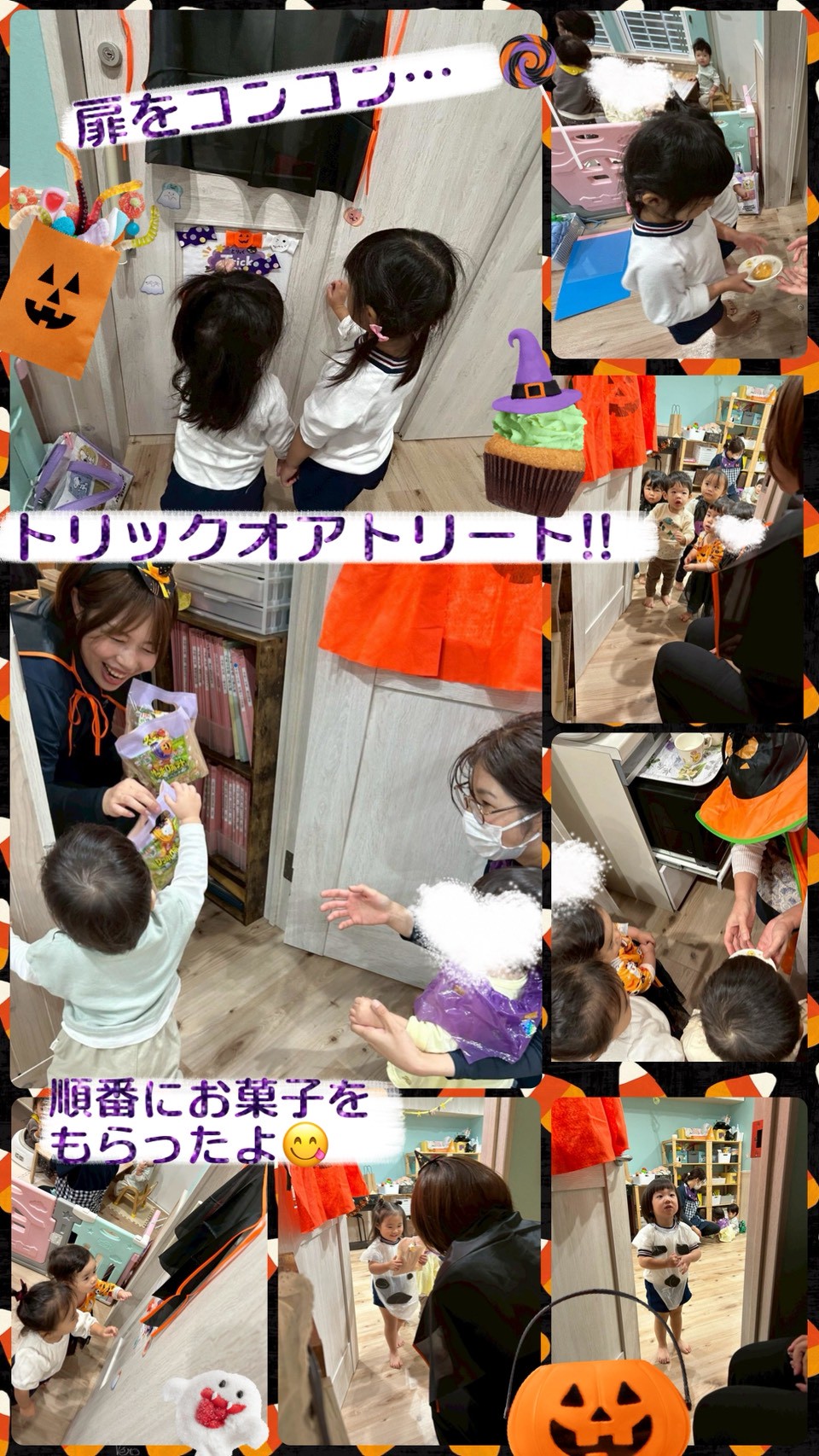 事務所や調理室の扉をノックし、「トリック・オア・トリート!!」でお菓子をもらいに行きました✨