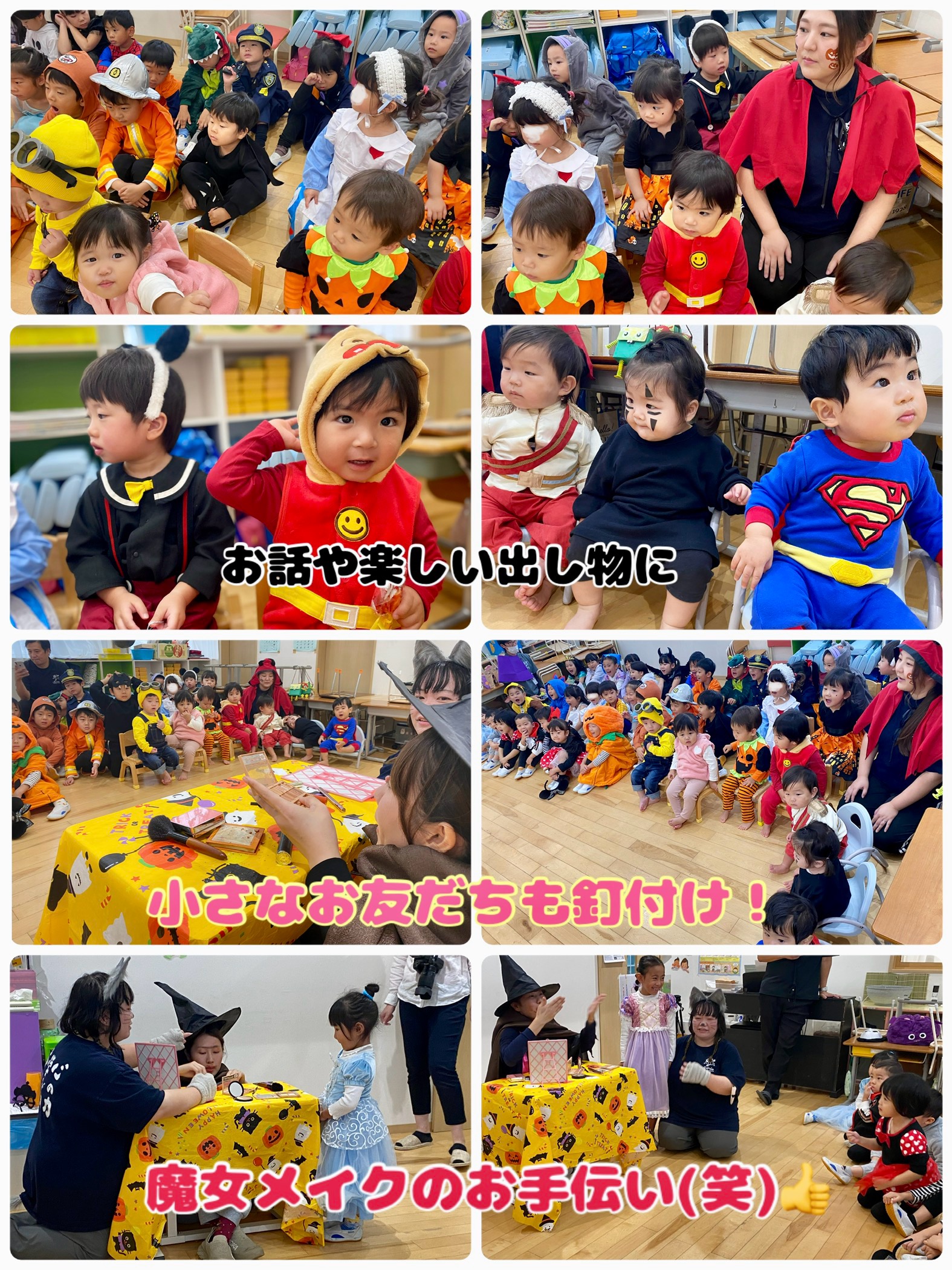ハロウィンパーティは、可愛いパペットからハロウィンの由来を聴いたり、二人羽織の魔女メイクを観賞したり、みんなでダンスを一緒に踊ったり、それぞれのクラスの仮装紹介、そして最後に「トリックアトリート!」でプレゼント🍭をもらいました.*・。♩