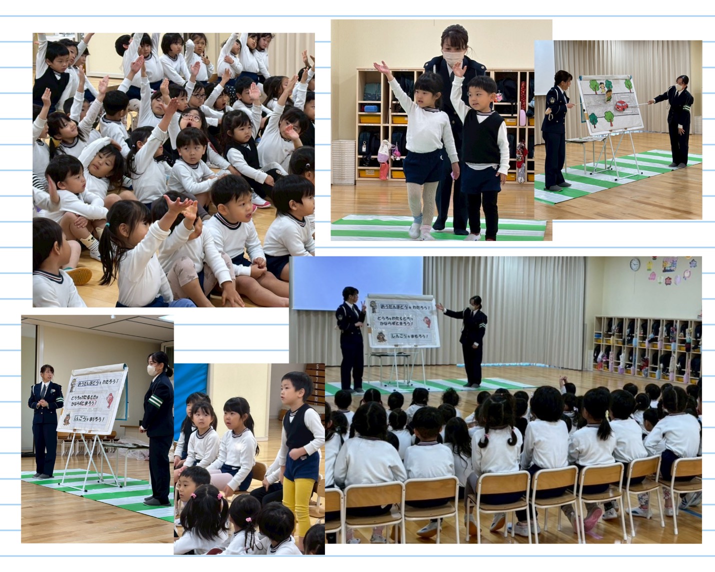 明石警察署の方にご協力いただいて、「交通安全教室」を実施しました。車での移動が多くなり、外を歩く機会が減っている今、学ぶ機会はとても大切であると考えています。実際に信号を見ながら横断歩道を渡る体験もしました。子どもたちは真剣な表情で話しを聞き、「右見て〜左見て」と教えていただいたことを実践する姿がありました。