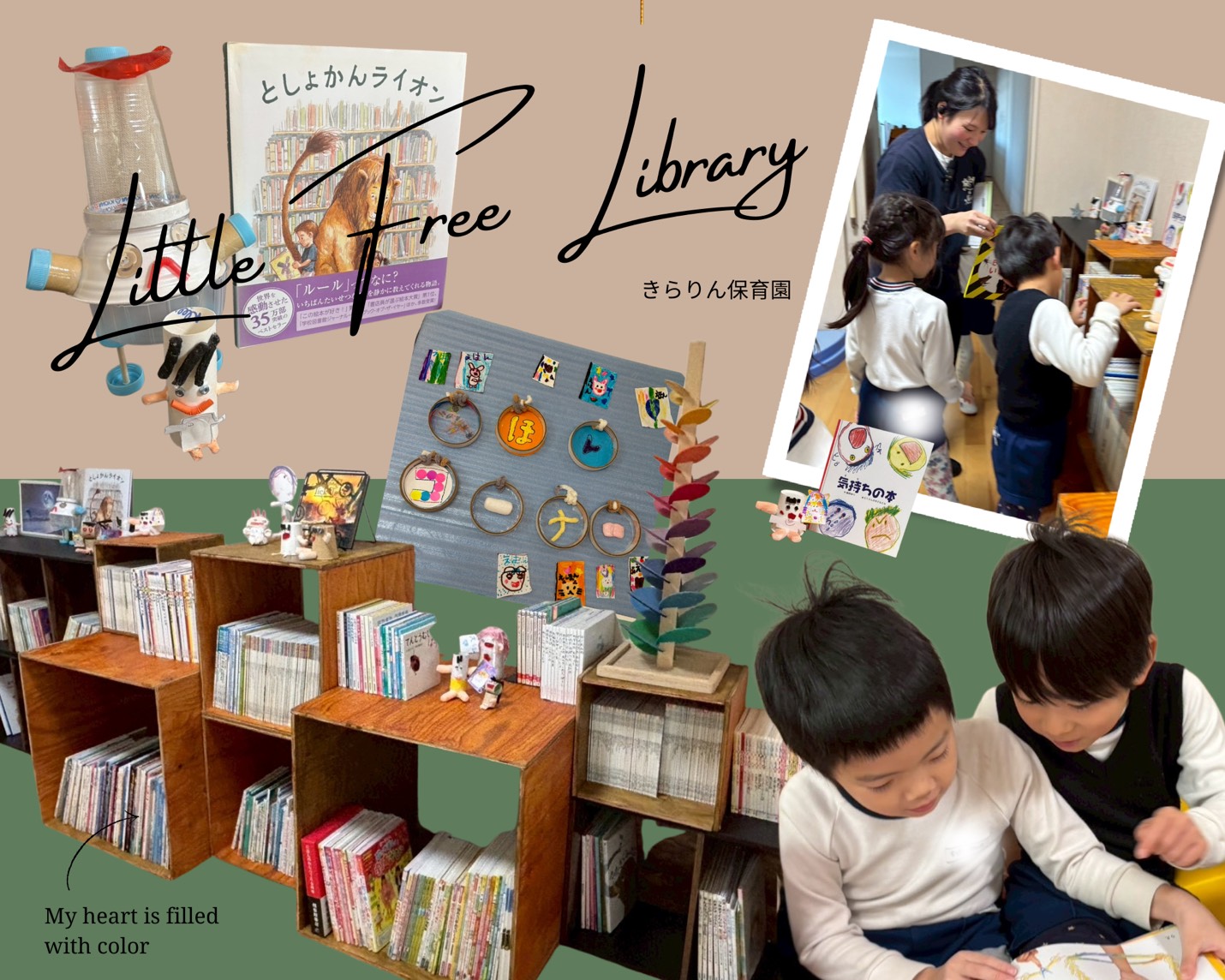 きらりんに「絵本コーナー」を作りたい!…にじ組さんの発案でこのプロジェクトがスタートしました。木を磨き、ニスを塗り、組み立てまで子どもたちはこの日を楽しみに取り組んできました。「誰かの喜ぶ姿」を楽しみに取り組むことはとても大切なことだと考えています。また新たな空間が子どもたちの育ちを支えてくれたらと願っています。