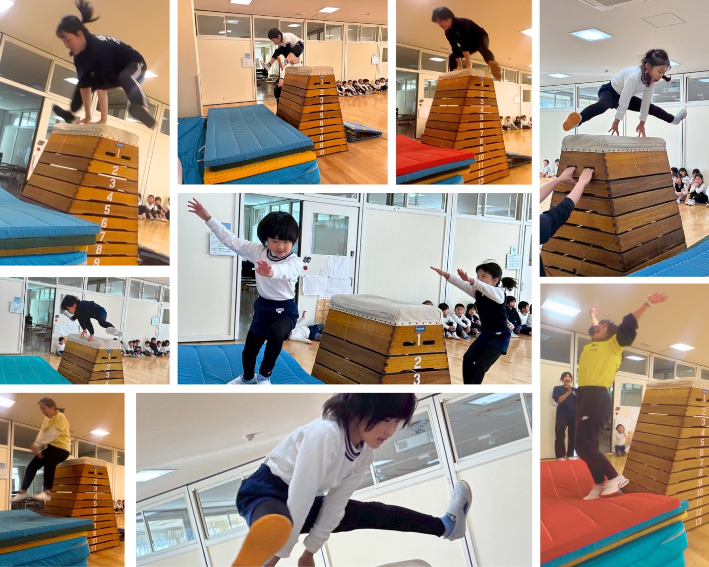 にじ組さんと共に「きらりん跳び箱チャレンジ」を開催しました。先生たちも真剣です!…子どもたちには負けたくないとこっそり練習する姿も…みんなが頑張る姿から、普段以上の力を発揮するそんな姿も見られ、会場はたくさんの応援と拍手に包まれました。みんなで一体となって何かに取り組む…そんな体験もどんどん楽しんでいきたいと思っています。