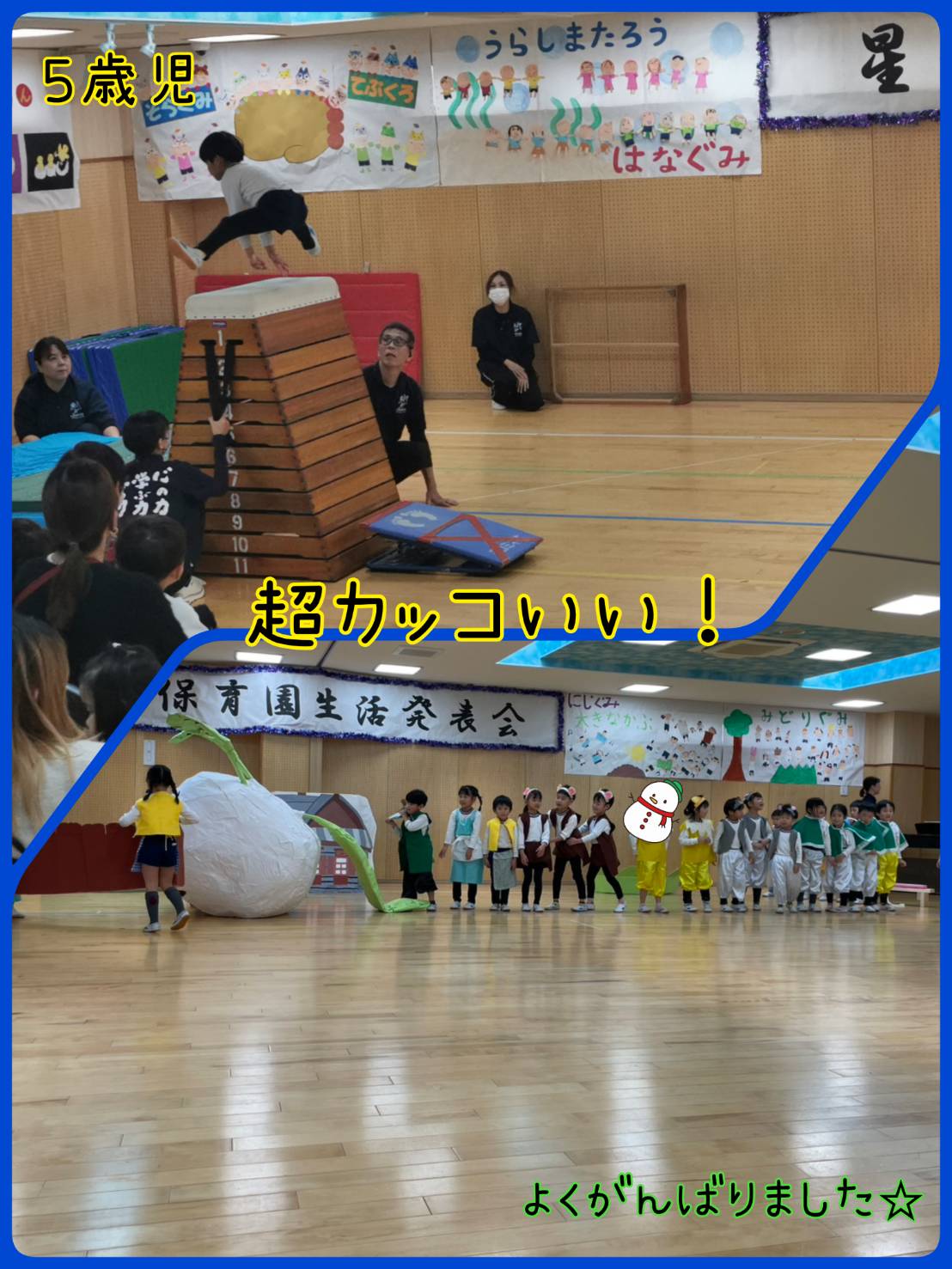 生活発表会がありました。子どもたちの普段の様子や、園での取り組みをご覧いただけたかと思います。たくさん褒めてあげてくださいね。もうすぐクリスマスですね。サンタさんは今年もやってくるかなぁ。