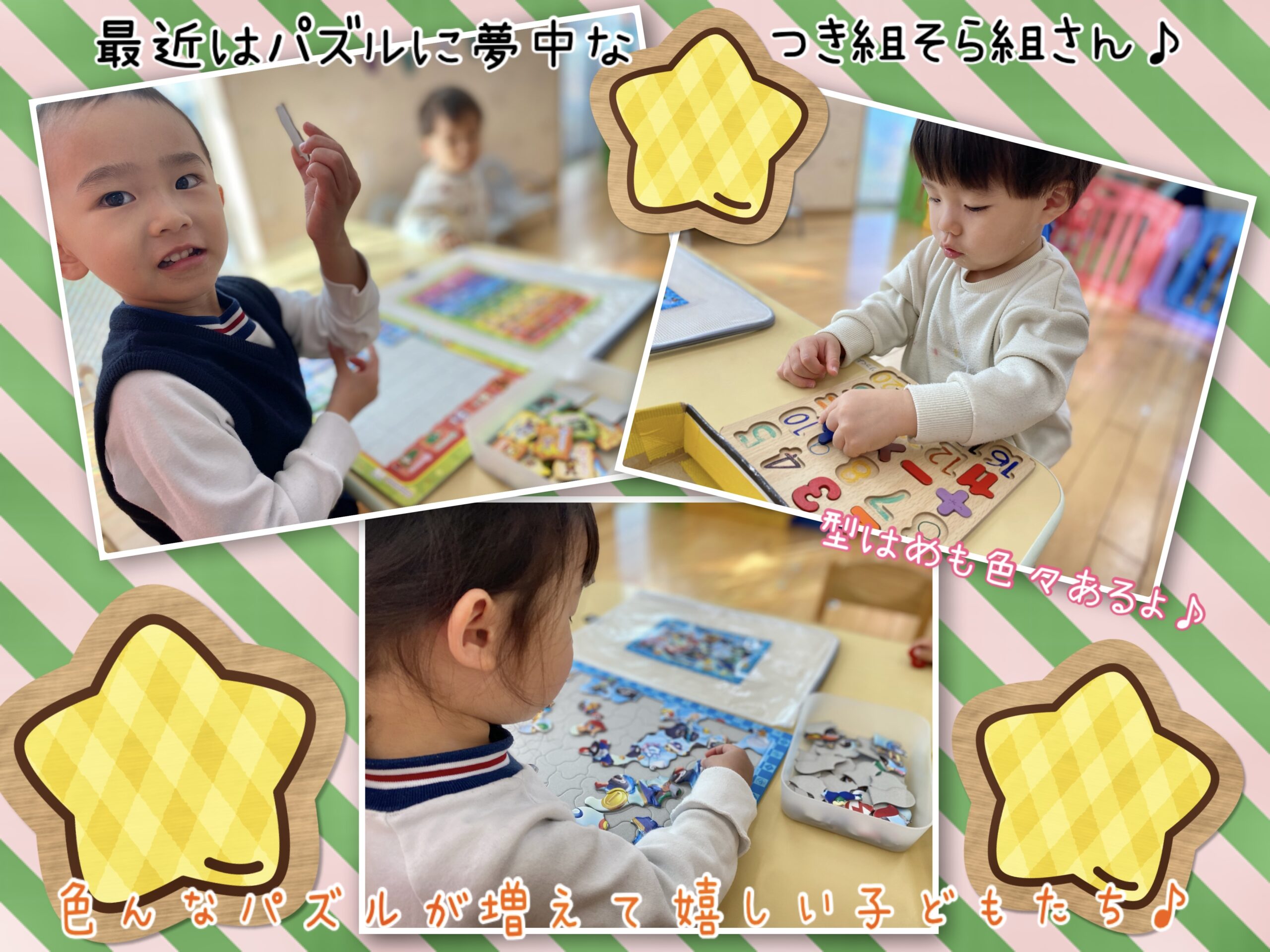 最近新しく増えたパズルやブロックに夢中な子どもたち。黙々と集中して一人で仕上げる姿もあれば、友だちとここかな?あそこかな?と話しながら作る姿もあったり😊