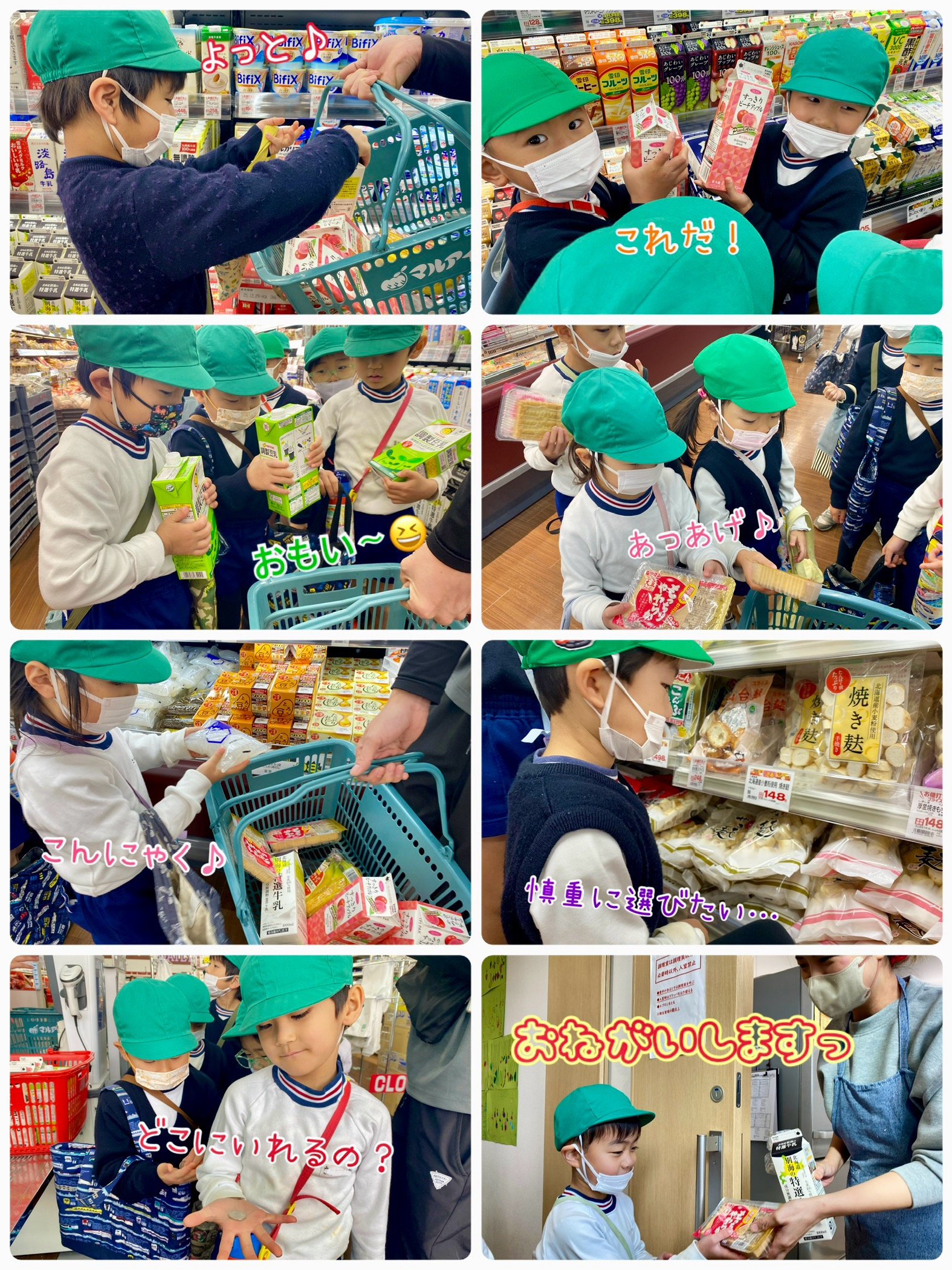 それぞれ担当の食材を事前に話し合って決め、スーパーでの約束事、買い物をする上での約束事も事前に聞いていたので、当日はみんなしっかり約束を守ってスムーズにお買い物を達成することができました!やはりみどり組さんも馴染みのスーパーだという子が多かったです😊
