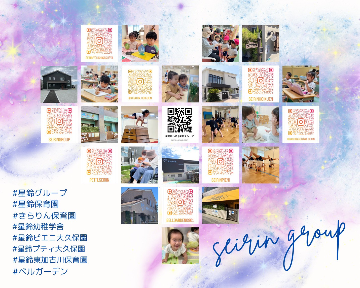 【星鈴グループ園】☆星鈴保育園(明石市認可保育園)★きらりん保育園(明石市認可保育園)☆星鈴プティ大久保園(明石市認可小規模保育園)★星鈴幼稚学舎(小規模保育園・学童保育)☆星鈴ピエニ大久保園(企業主導型保育園)★星鈴東加古川保育園(加古川市認可小規模保育園)☆発達支援フォローアップ(児童発達支援・放課後等デイサービス)★発達支援フォルテシモ(児童発達支援・放課後等デイサービス)