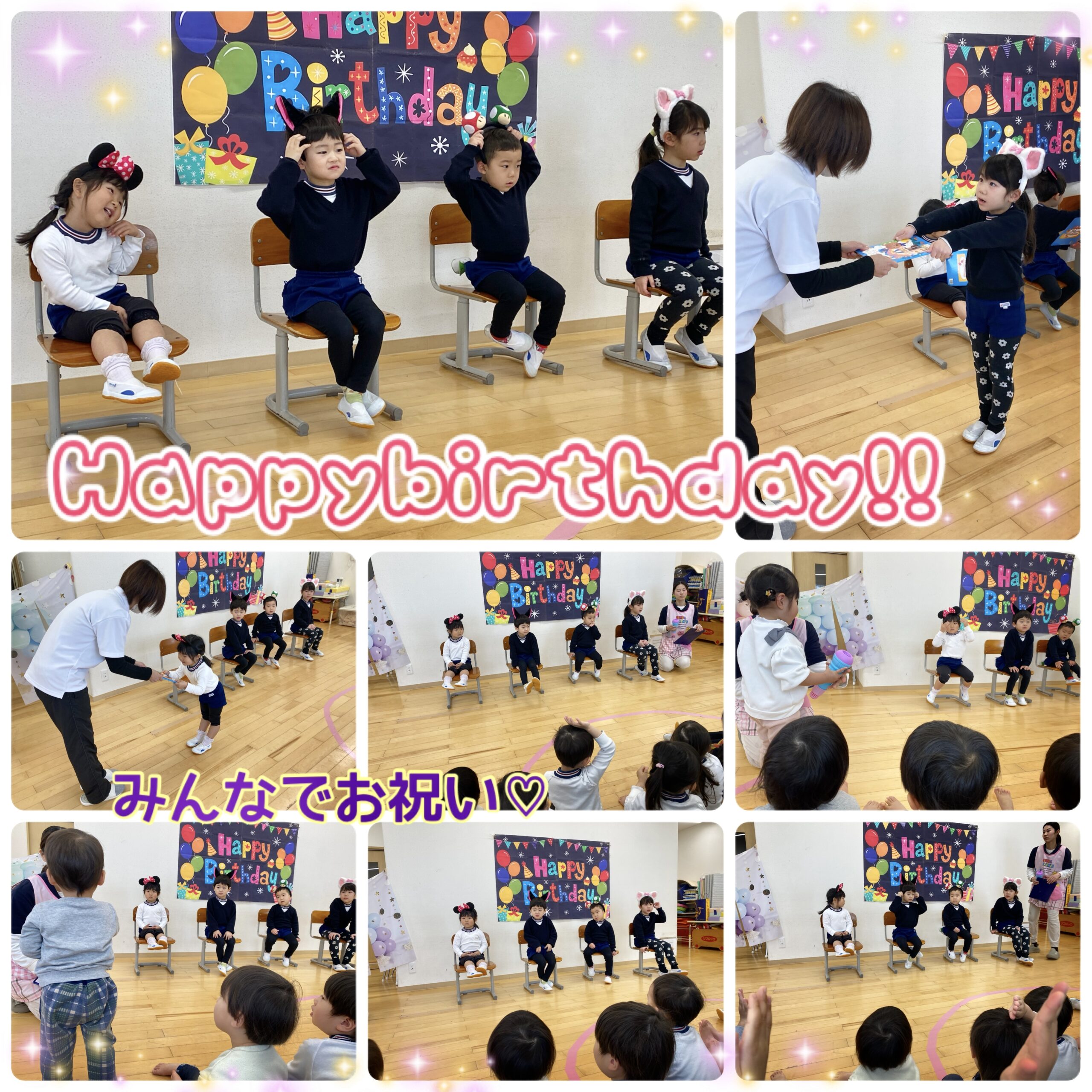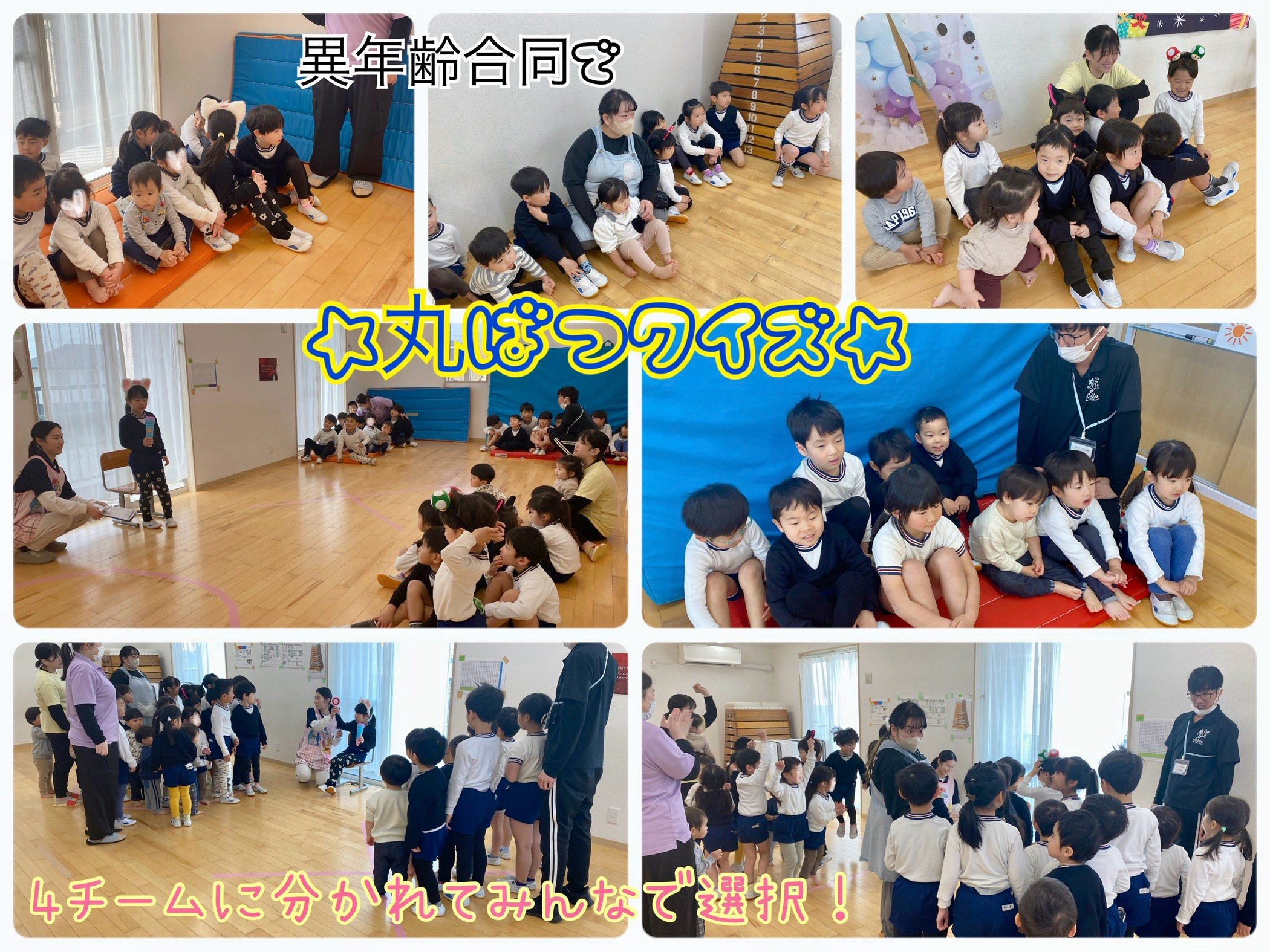 誕生日会の出し物では、異年齢合同4チームに分かれてチーム戦の〇×クイズをしました!どっちに行くか相談し合い、優勝したチームには担当職員手作りの💛ぷっくりPIENIシール💛のプレゼントが‼笑 にじ組さんがクイズ内容を考えて出題してくれました✨
